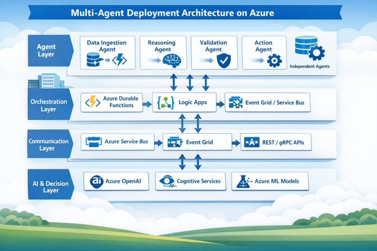 On Azure, these agents are commonly deployed using Azure Functions, Azure Container Apps, or Azure Kubernetes Service (AKS). Each agent is designed as a stateless service, which allows Azure to scale it independently based on demand.