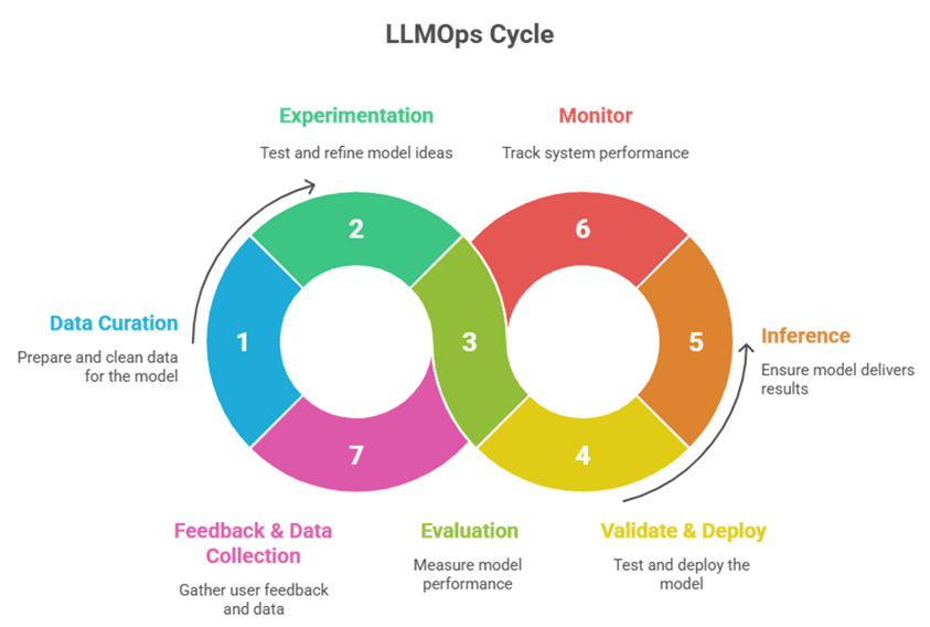 We can think of LLMOps as a workflow cycle that ensures LLM-based solutions are built, tested, deployed, and improved efficiently.