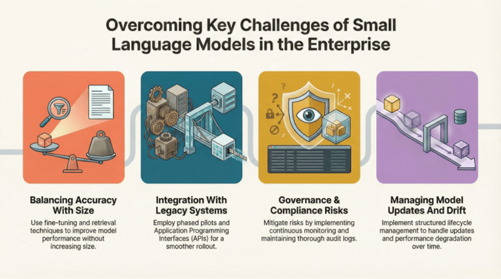 - Integration with legacy systems is another hurdle. Enterprise environments are rarely clean or uniform. Introducing an SLM requires phased pilots, API abstractions and careful testing to ensure the model works smoothly with existing platforms without disrupting established processes.